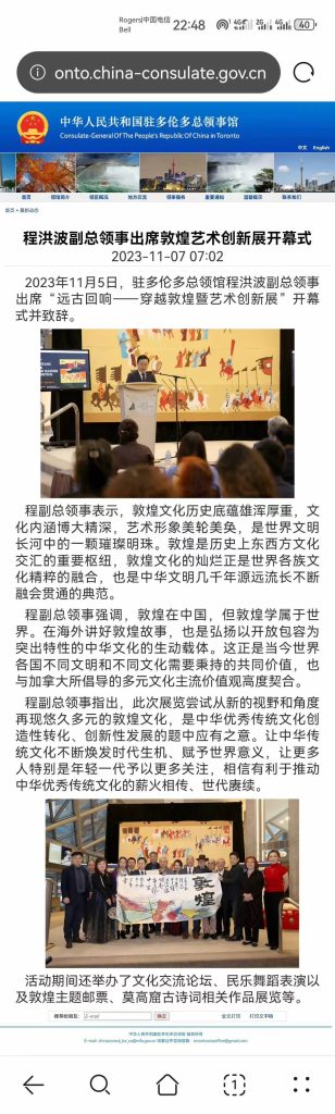 此次“远古回响——穿越敦煌暨艺术创新展”由加拿大大爱文化基金会、加拿大海峡文化交流基金会、加拿大华人同乡会联合总会共同主办。艺术家们对敦煌壁画元素的再创作是这一展览的一大看点。画家张迟等艺术家以及来自加拿大和中国的儿童以各自视角、不同手法描绘出心中的敦煌印象。